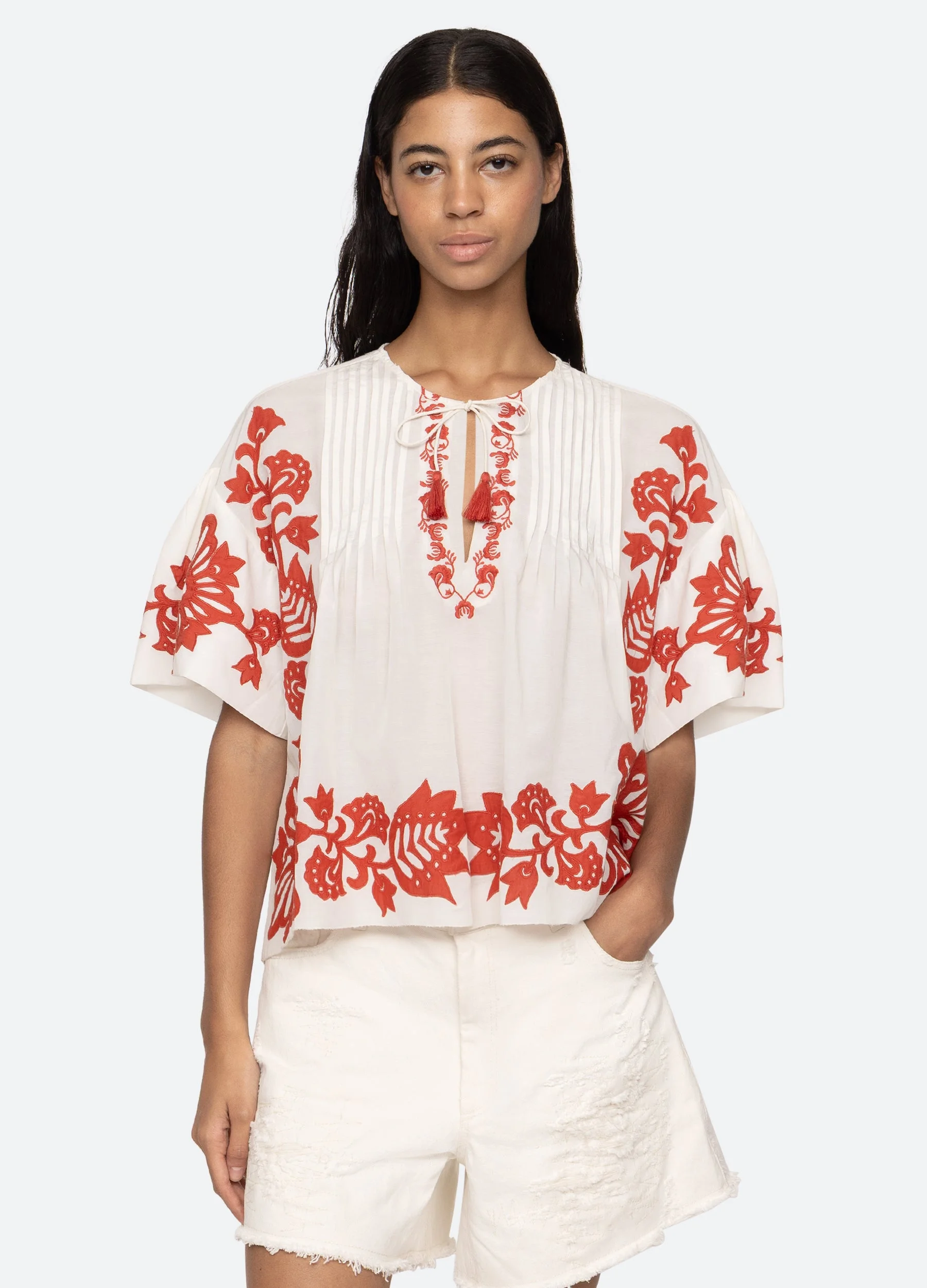 The Liliana applique short sleeve top features tassel neck ties, pleated detailing and short flowy sleeves. DETAILS - self-52% cotton, 48% viscose - applique-52% cotton, 48% viscose - front tie closure - designed for a relaxed fit - style #PF25-065 - model is 5'10'' and wearing a size S