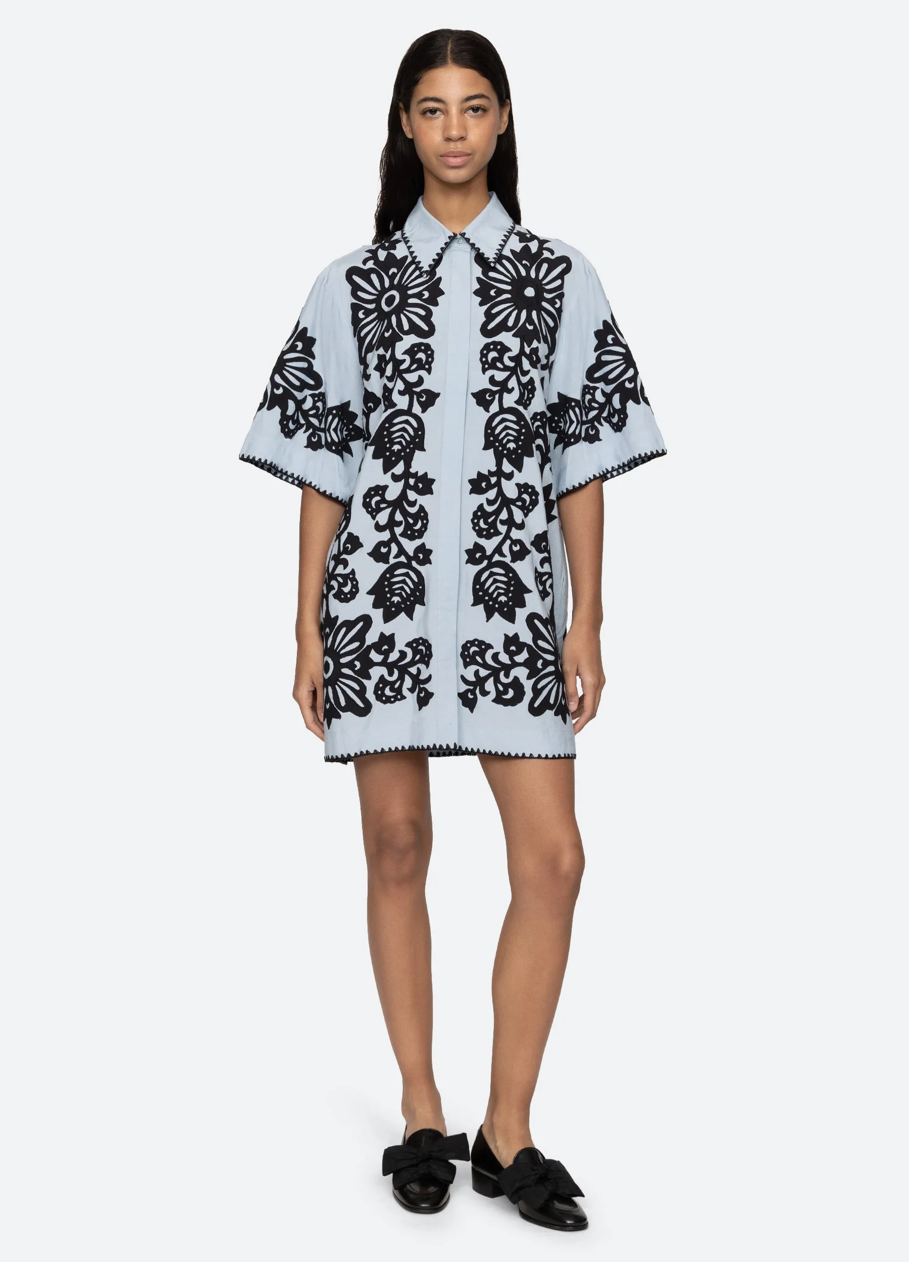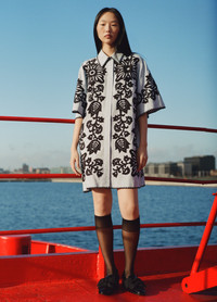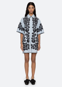 The Liliana applique shirt dress features a sophisticated fusion of classic tailoring and intricate design. This dress features detailed crochet trim and a removable belt, adding a unique touch to its mini silhouette. Designed with a button-front closure, it offers both style and functionality. DETAILS - self-100% viscose - applique-100% viscose - button front - designed for a relaxed fit - style #PF25-066 - model is 5'10'' and wearing a size S