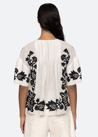 The Liliana applique short sleeve top features tassel neck ties, pleated detailing and short flowy sleeves. DETAILS - self-52% cotton, 48% viscose - applique-52% cotton, 48% viscose - front tie closure - designed for a relaxed fit - style #PF25-065 - model is 5'10'' and wearing a size S