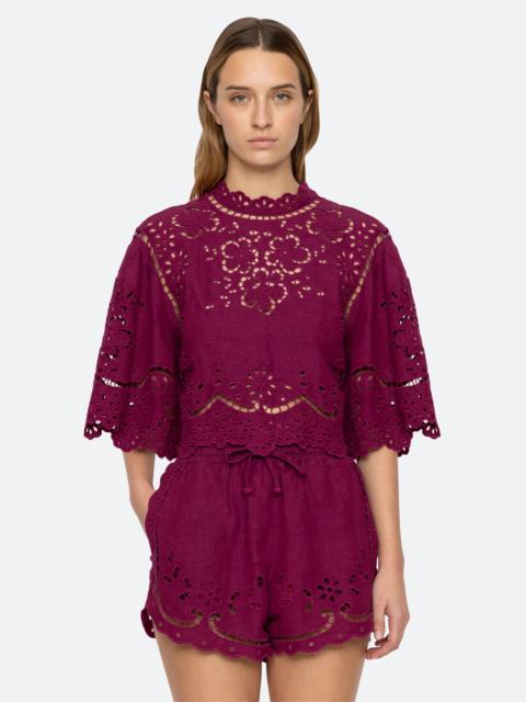 The Lula embroidered blouse features embroidered eyelet detailing throughout, v-neck line, long voluminous sleeves and cropped silhouette. DETAILS - 55% viscose, 45% linen - button front - designed for a relaxed fit - style #PF25-017 - model is 5'10'' and wearing a size S