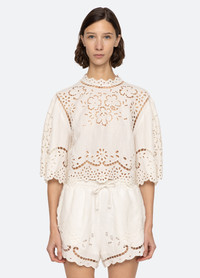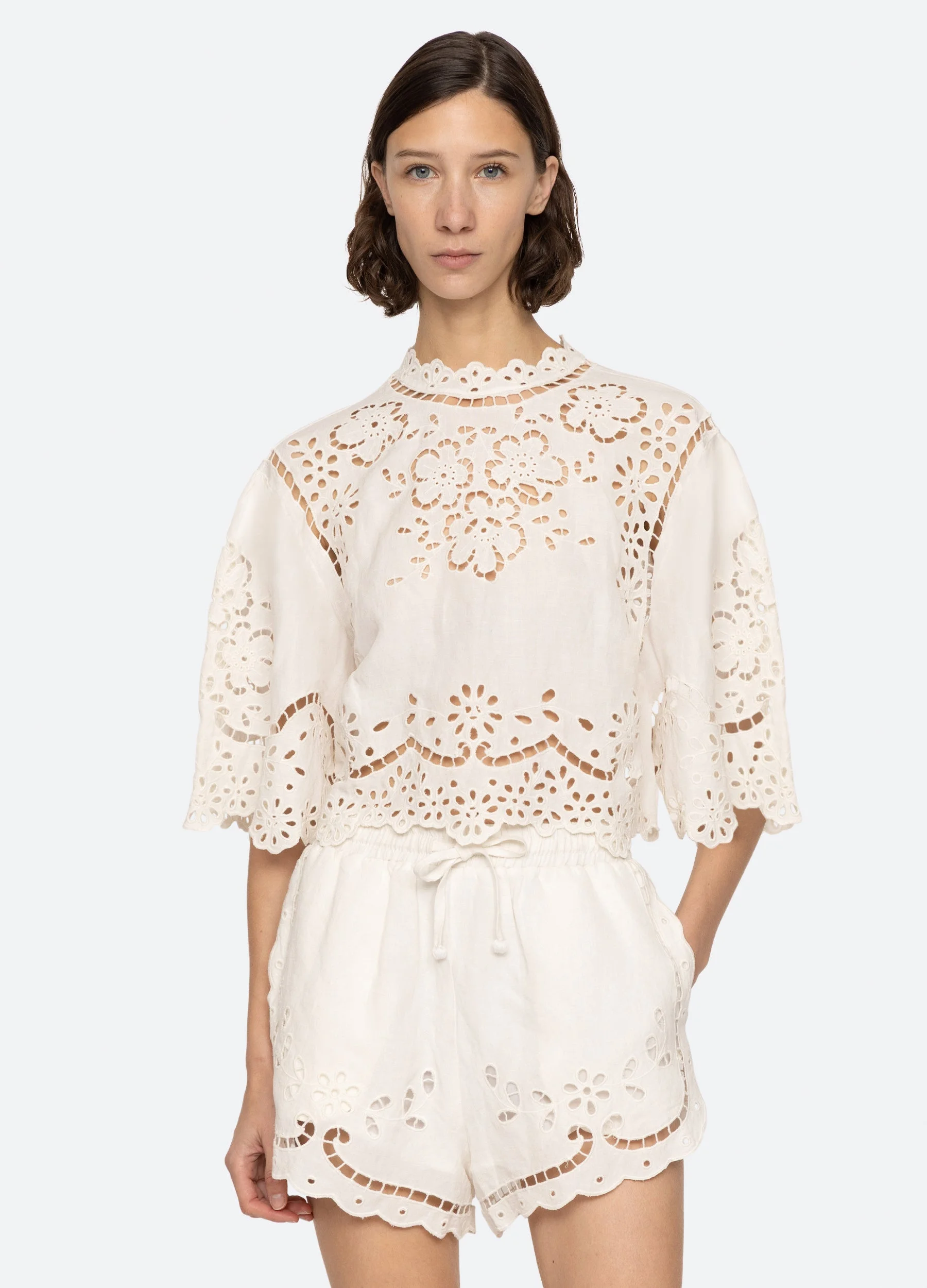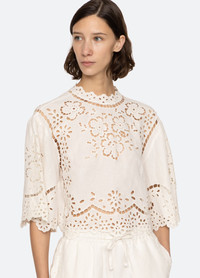 The Lula embroidered top features embroidered eyelet detailing throughout, short flowy sleeves, high neck and cropped silhouette. DETAILS - 45% viscose, 45% linen - button back fastening - designed for a relaxed fit - style #PF25-016 - model is 5'10'' and wearing a size S