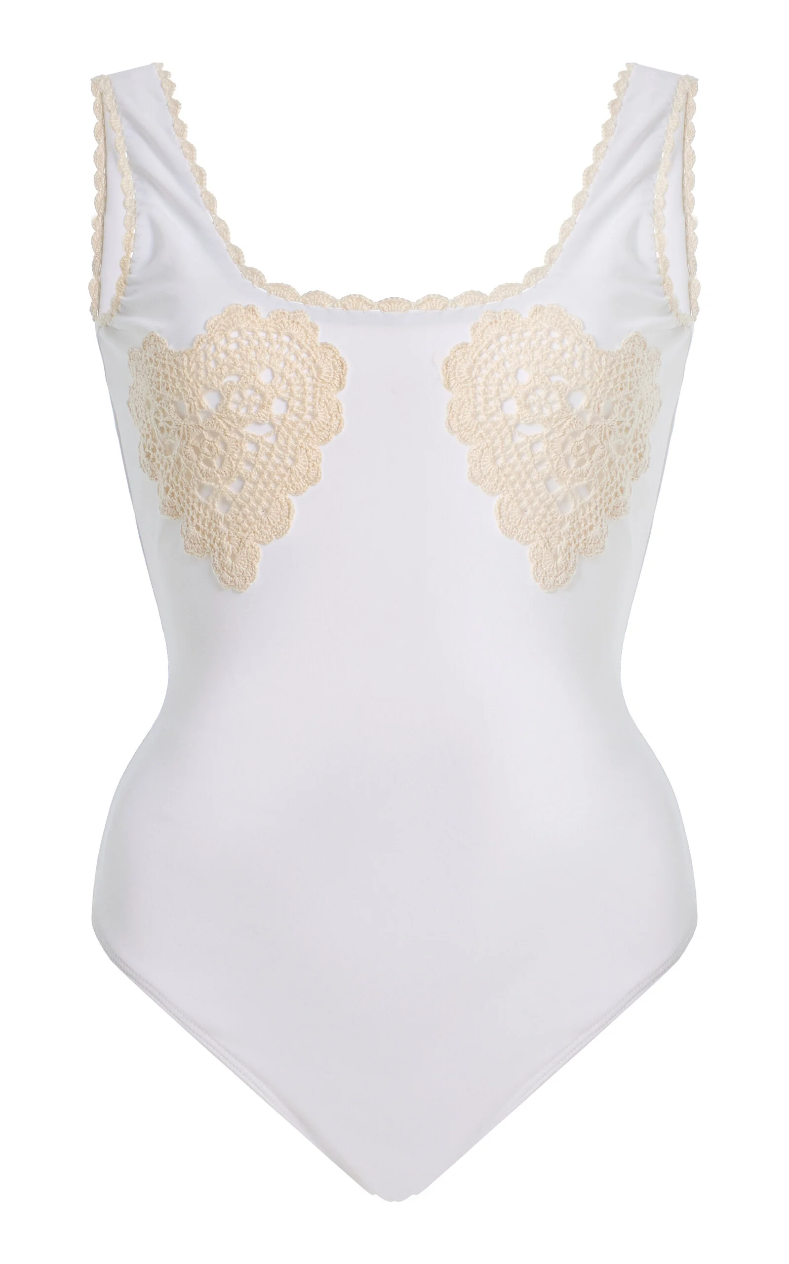 NYC-based Monica Paolini and Sean Monahan dream up pieces that resemble the perfect vintage find—and this season, they lean into their signature cool folksy-femininity. This one-piece swimsuit is accented with delicate crochet hearts on the bodice. This one is sweet, flirty, and made to turn heads under the sun. PRODUCT DETAILS - Spring '26 - Composition: 82% polyamide, 18% spandex; emb: 100% cotton - Dry clean - Imported