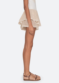 The Madelyn crochet skort is designed as a swim cover-up with a knit mesh base that creates a subtle sheer effect. Finished with an elasticized waistband, tiered hem, and delicate crochet trim, they pair seamlessly with the Madelyn top for elevated beachside styling. DETAILS - self-100% cotton - decoration-100% cotton - slip on - elasticized waist - designed for a relaxed fit - style #SS26-737 - model is 5'10'' and wearing a size S