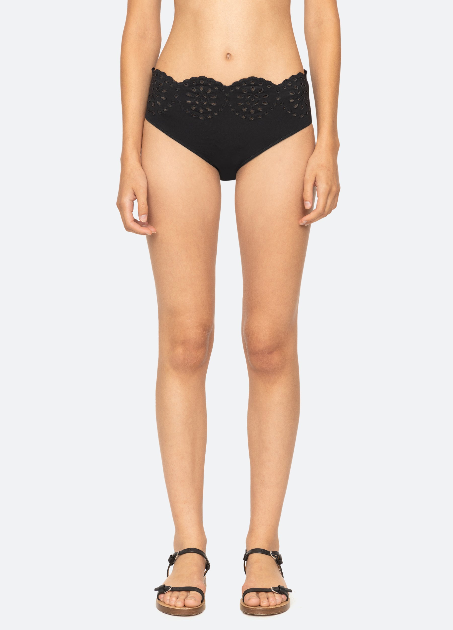 The Mae scallop bikini bottom features eyelet detailing and scalloped edges at the waist. DETAILS - self-75% nylon, 25% spandex - lining-94% nylon, 6% spandex - embroidery-100% polyester - slip on - designed for a slimmer fit - style #SS25-717 - model is 5'10'' and wearing a size S