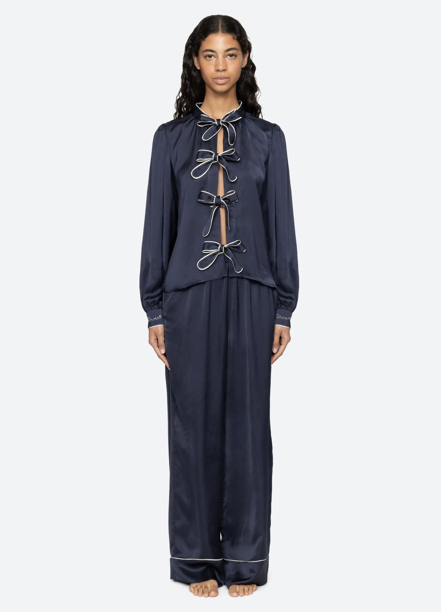 The Marceline pajama set features elegant front tie closures and contrast trim detailing. "Sweet Dreams" embroidery on the cuffs adds a whimsical detail to this set. DETAILS - 100% viscose - tie front - elasticized waist - designed for a relaxed fit - style #RS26-802 - model is 5'10'' and wearing a size S