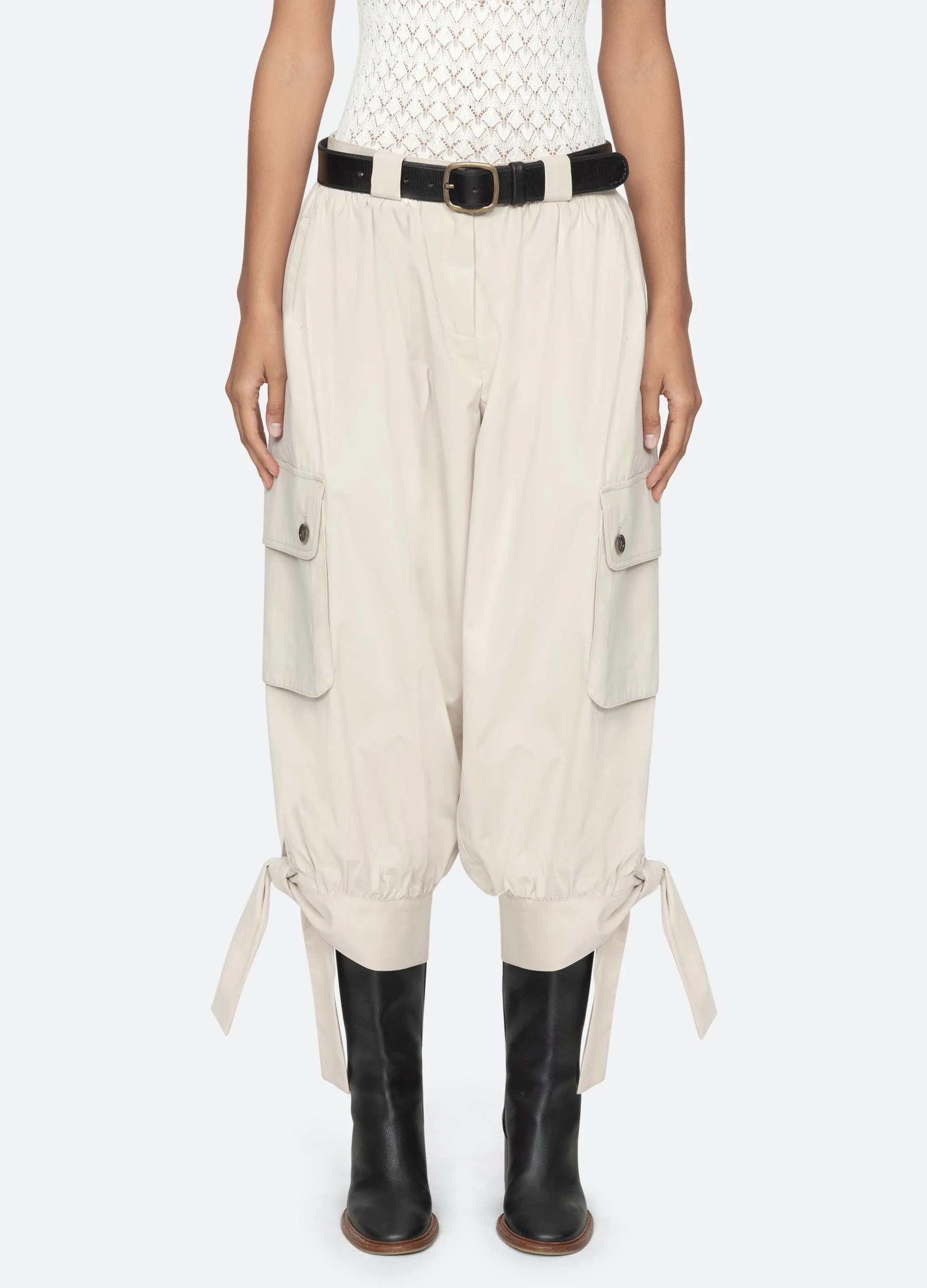 The Miles workwear pants fuse practical utility with modern edge. This style features oversized pockets, side tie hems, a removable belt, and a cropped silhouette for a structured yet relaxed look. DETAILS - 100% cotton - button & zipper closure - designed for a relaxed fit, slim waist - style #RS26-104 - model is 5'10'' and wearing a size S
