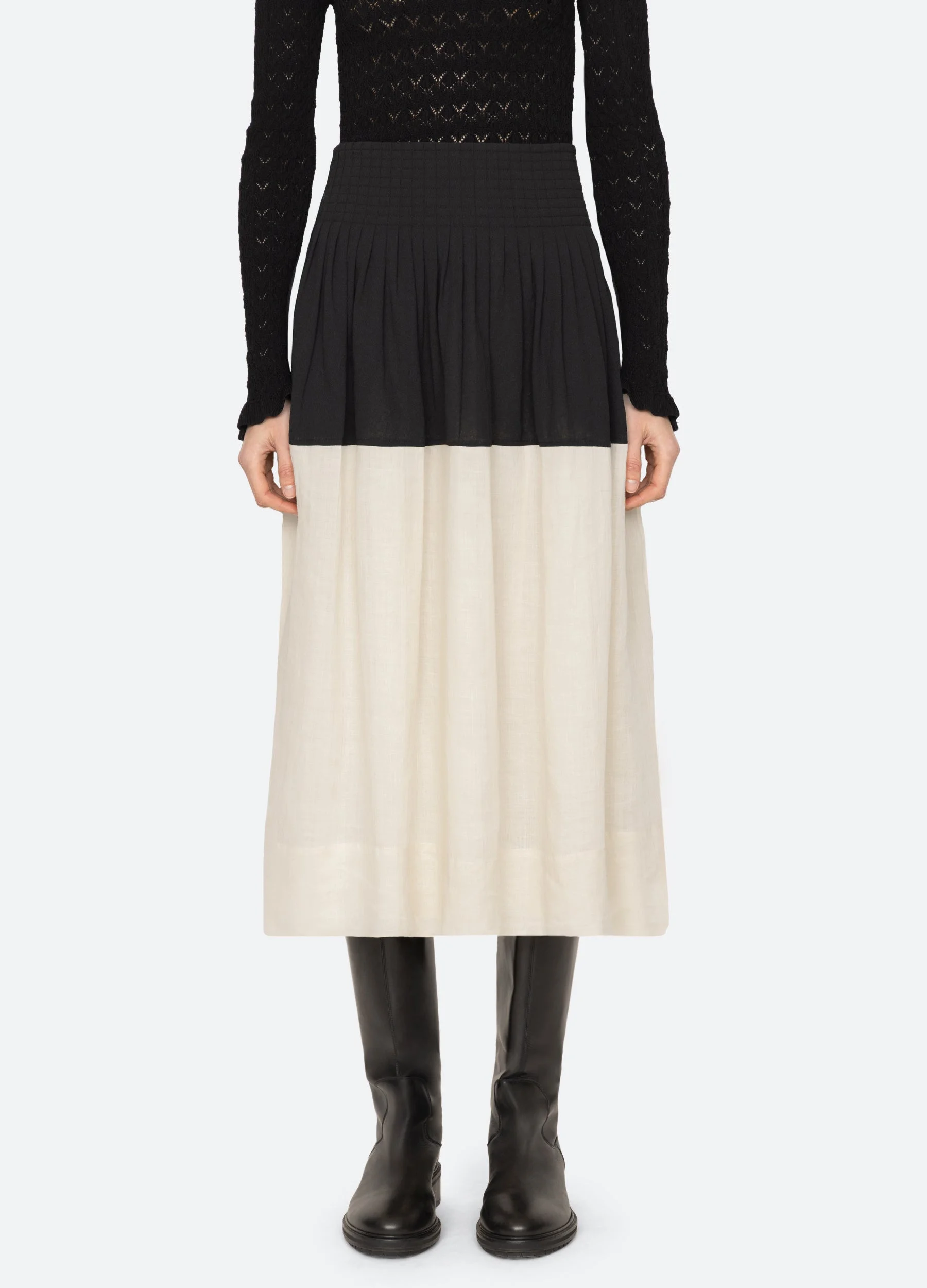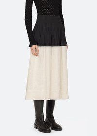 The Nicola skirt features an elasticized waistband, pleated detailing and midi silhouette. DETAILS - waistband-100% polyester - skirt panel-100% ramie - lining-100% cotton - slip on - elasticized back - designed for a slimmer fit - style #PF25-081 - model is 5'10'' and wearing a size S