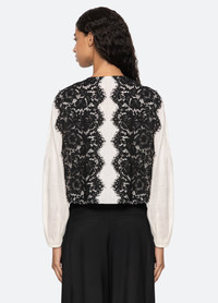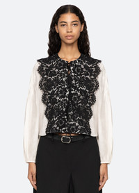 The Norabelle lace top features delicate floral lace across the bodice, while voluminous sleeves are accented with precise pleated detailing. Finished with elegant front tie closures, it embodies a refined, romantic allure. DETAILS - self-100% ramie - lace-90% cotton, 10% nylon - tie front closure - designed for a relaxed fit - style #AW25-111 - model is 5'10'' and wearing a size S