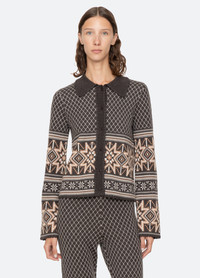 Part of the apres ski capsule, the Olympia fair isle knit cardigan is crafted with long, wide sleeves and a button front closure, creating a timeless silhouette infused with cozy seasonal charm. It pairs seamlessly with the Olympia knit pants for a relaxed, apres ski ready ensemble. DETAILS - 100% extrafine merino wool - button front - designed for a relaxed fit - style #AS25-036 - model is 5'10'' and wearing a size S