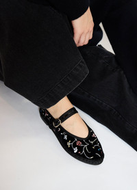An online exclusive. The Sea x Flabelus collaboration combines the art and craftsmanship of Spanish shoemaking with vintage-inspired beauty and design. The Priscilla velvet Mary Jane flats features detailed embroidery throughout, metal buckle and sole made from recycled bicycle tires. DETAILS - running small - please reference size chart for EU to US sizing - if you are in between sizes, we recommend sizing up to the nearest full size - the outside of the shoe is 100% cotton velvet, and the inside of the shoe is 100% organic cotton with anti-bacterial treatment - adjustable buckle closure - style #FL25-002