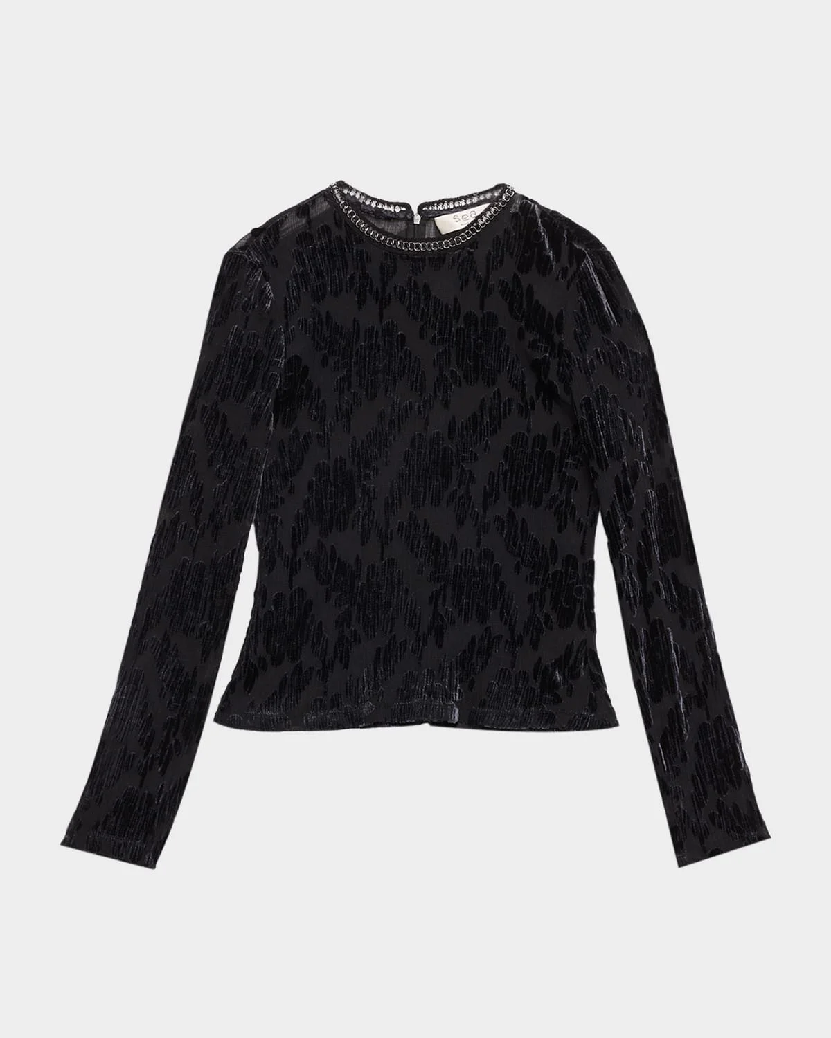 - Sea "Regine" burnout lace top elevated with a chain detail - Crew neckline - Long sleeves; approx. 25"L - Classic fit - Hem sits at the hip - Pullover style - Viscose/nylon/polyamide/spandex - Dry clean - Imported