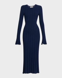 The "Rhea" midlength dress by Sea is knit with textural cable detailing and finished with lettuce trim detailing Crew neckline Long bell sleeves Hem falls below the knee Bodyskimming fit Slipover style Viscose Imported