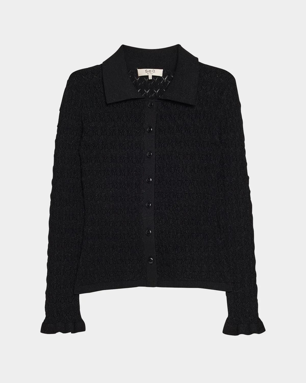 Sea "Ruby" pointelleknit cardigan Point collar; buttonfront Long sleeves with flared cuffs; approx. 24"L Fitted Hem sits at the hip Viscose Dry clean Imported