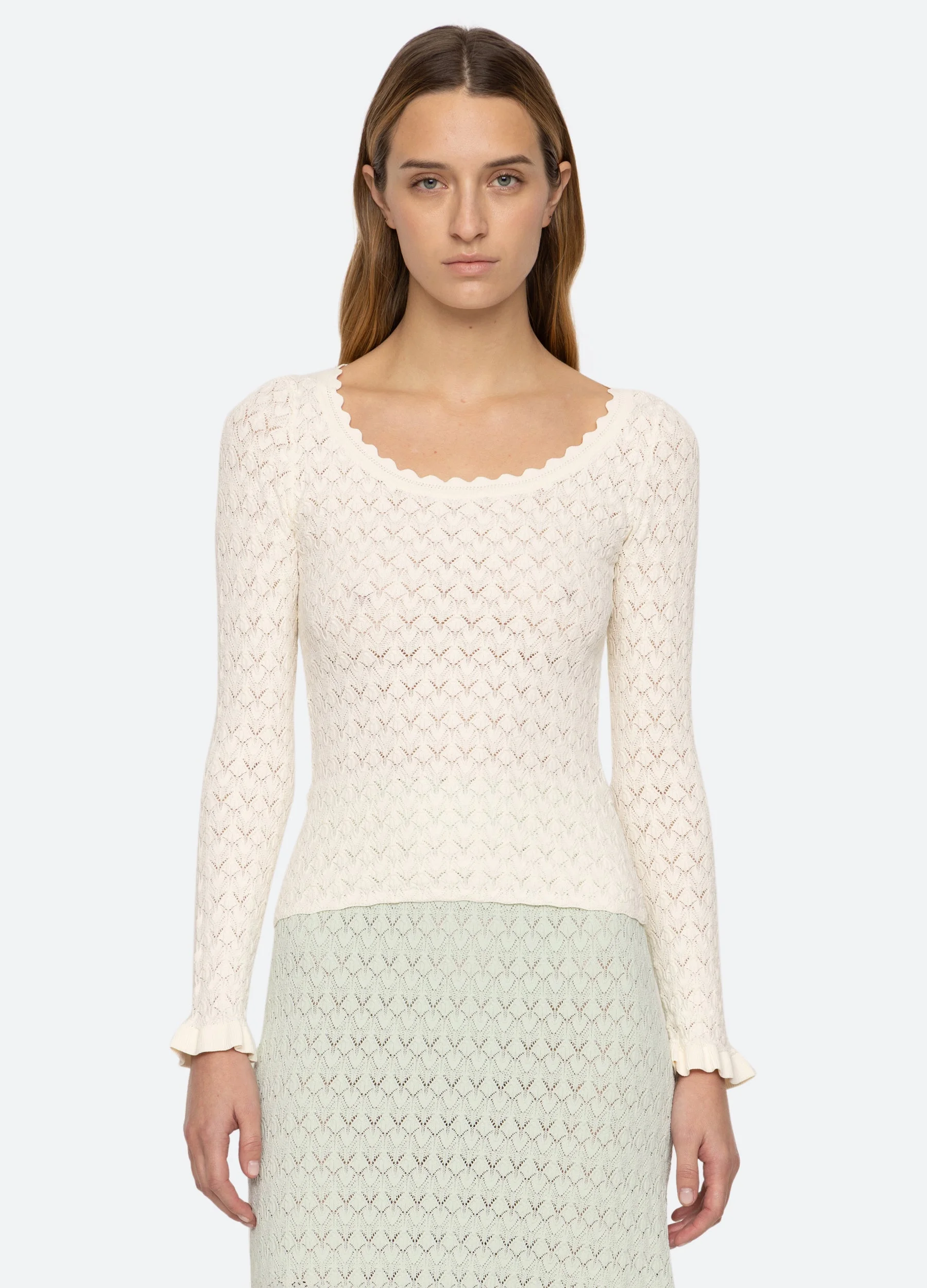 The Rue fine gauge knit long sleeve top features a scoop neck, ruffle cuffs and is designed for a slim fit. The perfect layering piece. DETAILS - 83% viscose, 17% elite - slip on - designed for a slimmer fit - style #PF25-082 - model is 5'10'' and wearing a size S