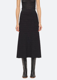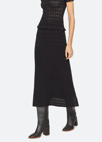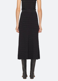 The Rue fine gauge knit skirt features a scalloped waistband, midi silhouette and is designed for a slim fit. DETAILS - 83% viscose, 17% elite - slip on - designed for a slimmer fit - style #PF25-084 - model is 5'10'' and wearing a size S