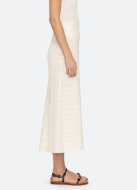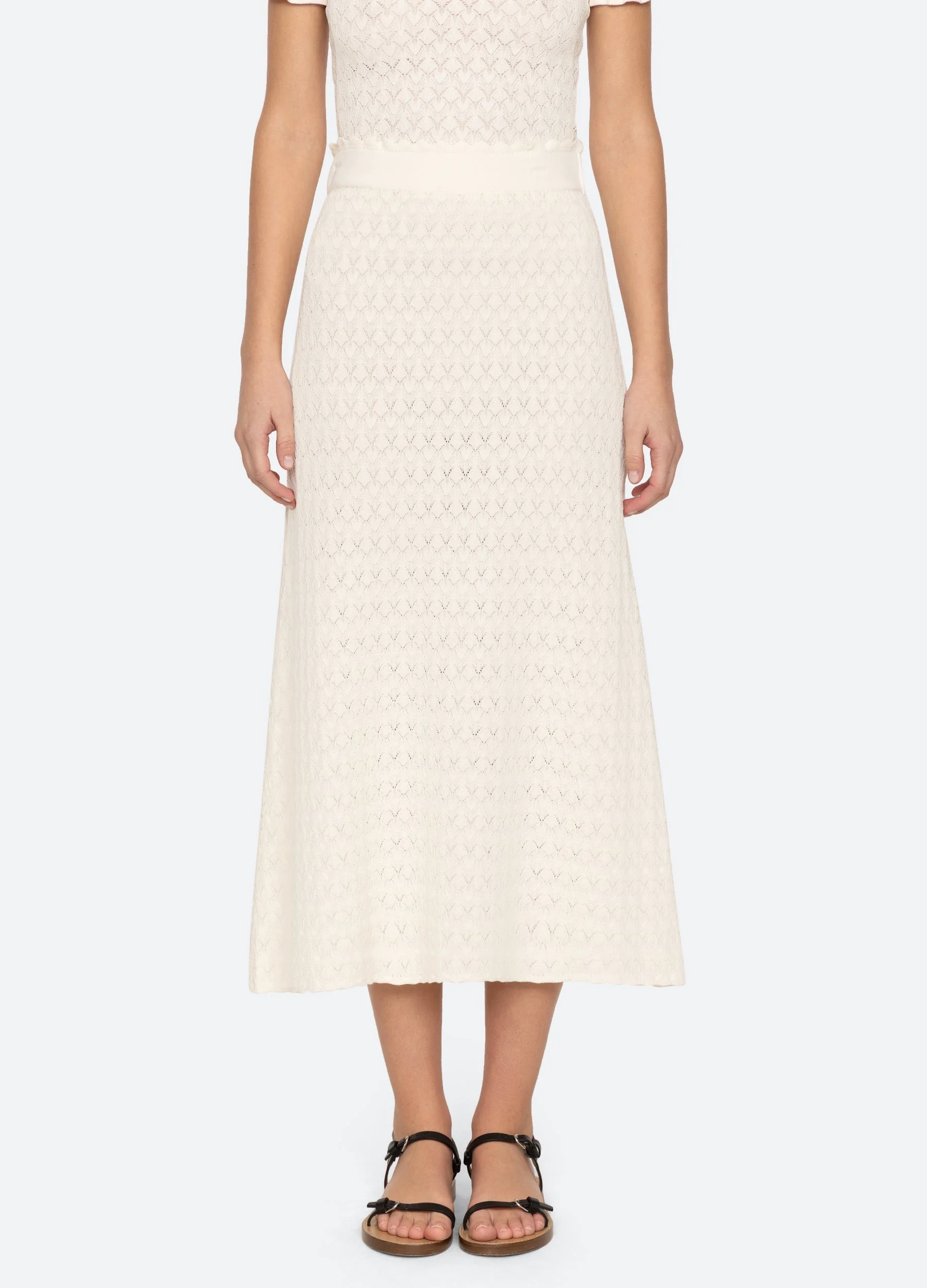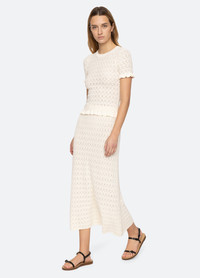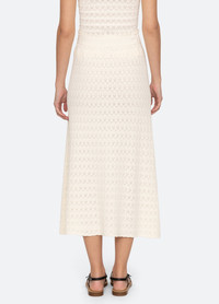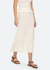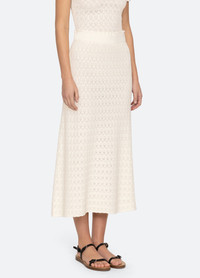 The Rue fine gauge knit skirt features a scalloped waistband, midi silhouette and is designed for a slim fit. DETAILS - 83% viscose, 17% elite - slip on - designed for a slimmer fit - style #PF25-084 - model is 5'10'' and wearing a size S