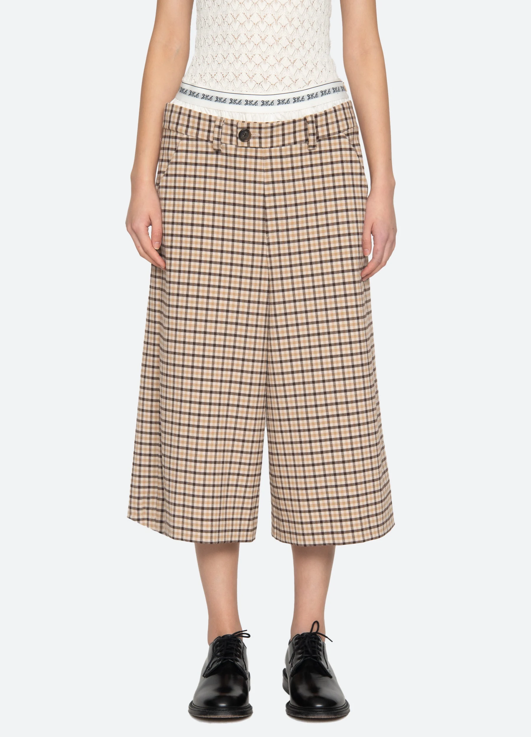 The Savannah plaid culottes feature a boxer-style waistband and a cropped, wide-leg silhouette. The design blends modern tailoring with a relaxed shape for an elevated, contemporary look. DETAILS - self-68% polyester, 30% viscose, 2% elastane - lining-100% polyester - invisible side zipper - designed for a slimmer fit - style #SS26-132 - model is 5'10'' and wearing a size 4