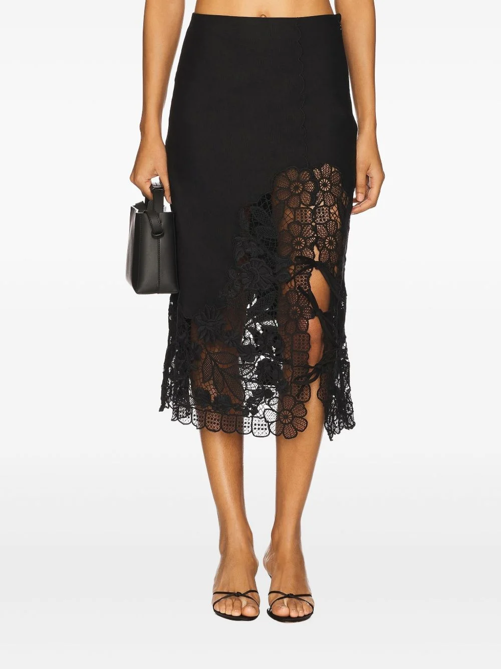 scallop-hem lace-insert skirt Highlights - Black - Scallop hem - Lace insert - Floral lace pattern - Side slit - Midi length Imported Composition Linen/Flax 52%, Cotton 48% Washing instructions Read Manufacturer Guidelines