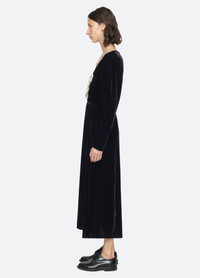The Seraphine velvet dress showcases a plunging v-neckline and voluminous long sleeves. Fixed satin bow accents add a romantic, statement-making finish. DETAILS - self-80% wool, 20% rayon - lining-100% cotton - decoration-100% polyester - slip on - elasticized waist - designed for a relaxed fit - style #RS26-023 - model is 5'10'' and wearing a size S