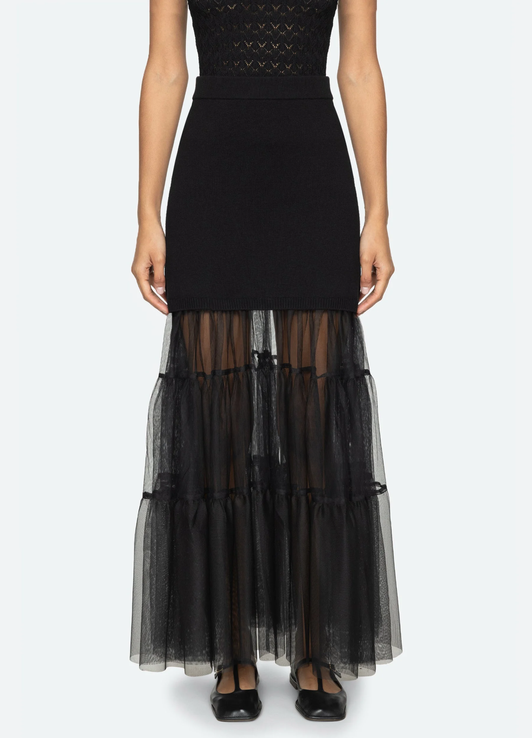 The Seraphine skirt pairs a fitted ribbed-knit with a tiered tulle skirt. Sheer layers lend an airy, ethereal quality, creating graceful movement with every step. DETAILS - self-95% cotton, 5% cashmere - combo-100% polyester - slip on - elasticized waist - style #RS26-024 - model is 5'10'' and wearing a size S