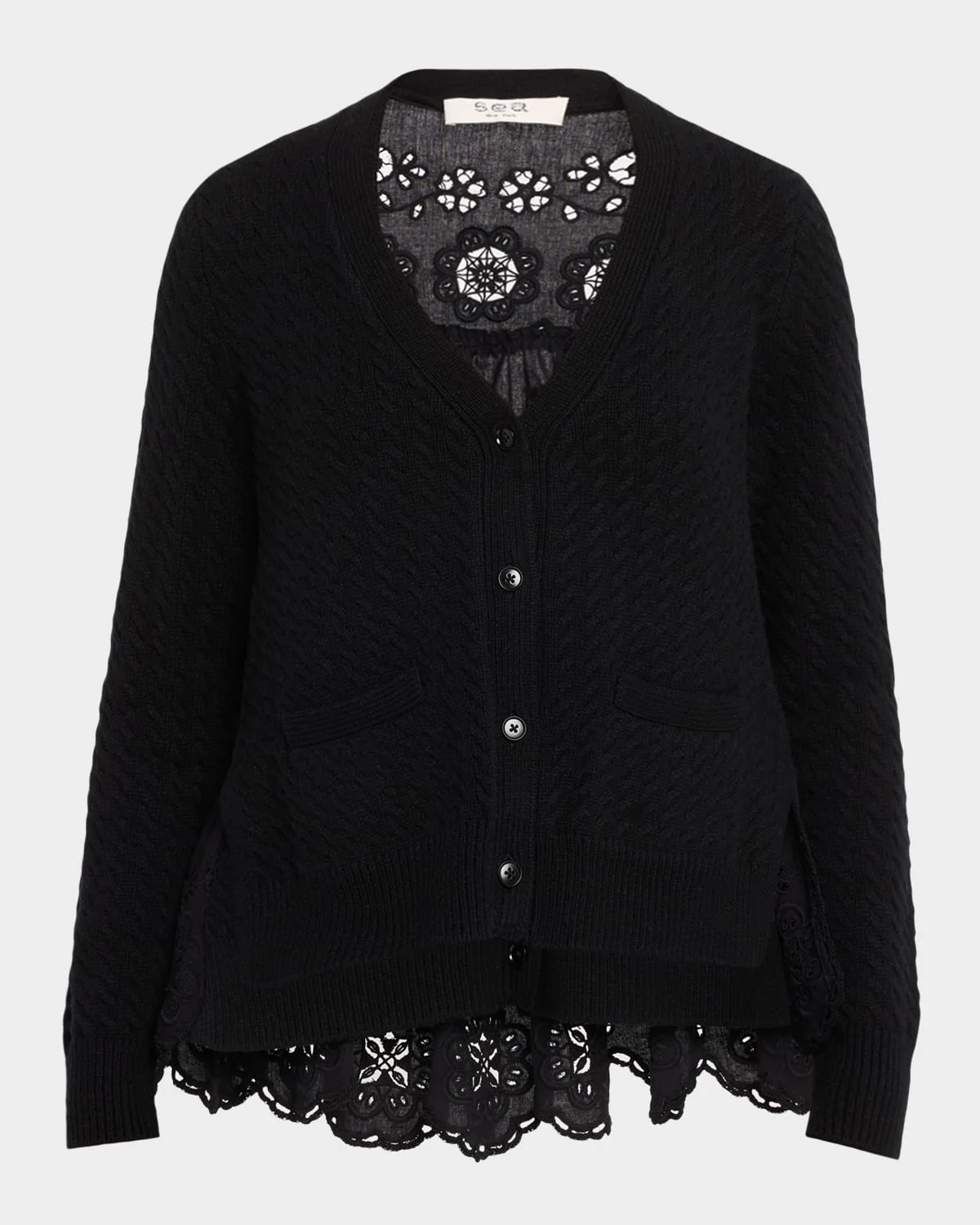 - Sea "Shanna" wool-blend cardigan elevated with a lace embroidered back panel - V neckline - Long sleeves; approx. 23.8"L - Patch pockets - Relaxed fit - Hem falls to the hip - Button-front - Merino wool/cotton/nylon/polyamide - Dry clean - Imported
