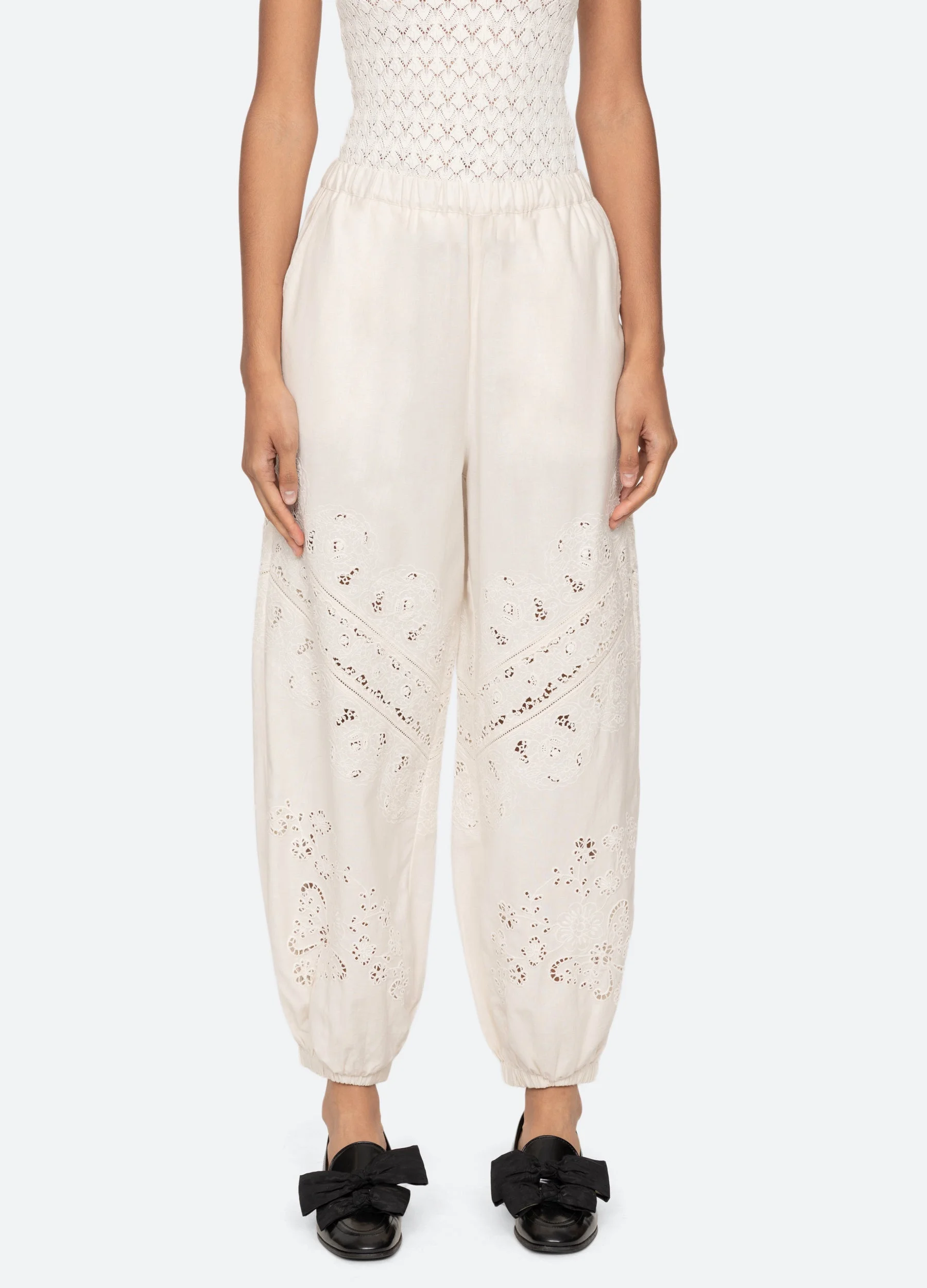 The Shanna lace pants capture an effortless blend of sophistication and comfort. Designed with an elasticized waistband for an easy, flattering fit, they feature intricate lace with sheer detailing that adds a romantic touch. DETAILS - 88% cotton, 12% linen - slip on - designed for a relaxed fit - style #AW25-127 - model is 5'10'' and wearing a size S