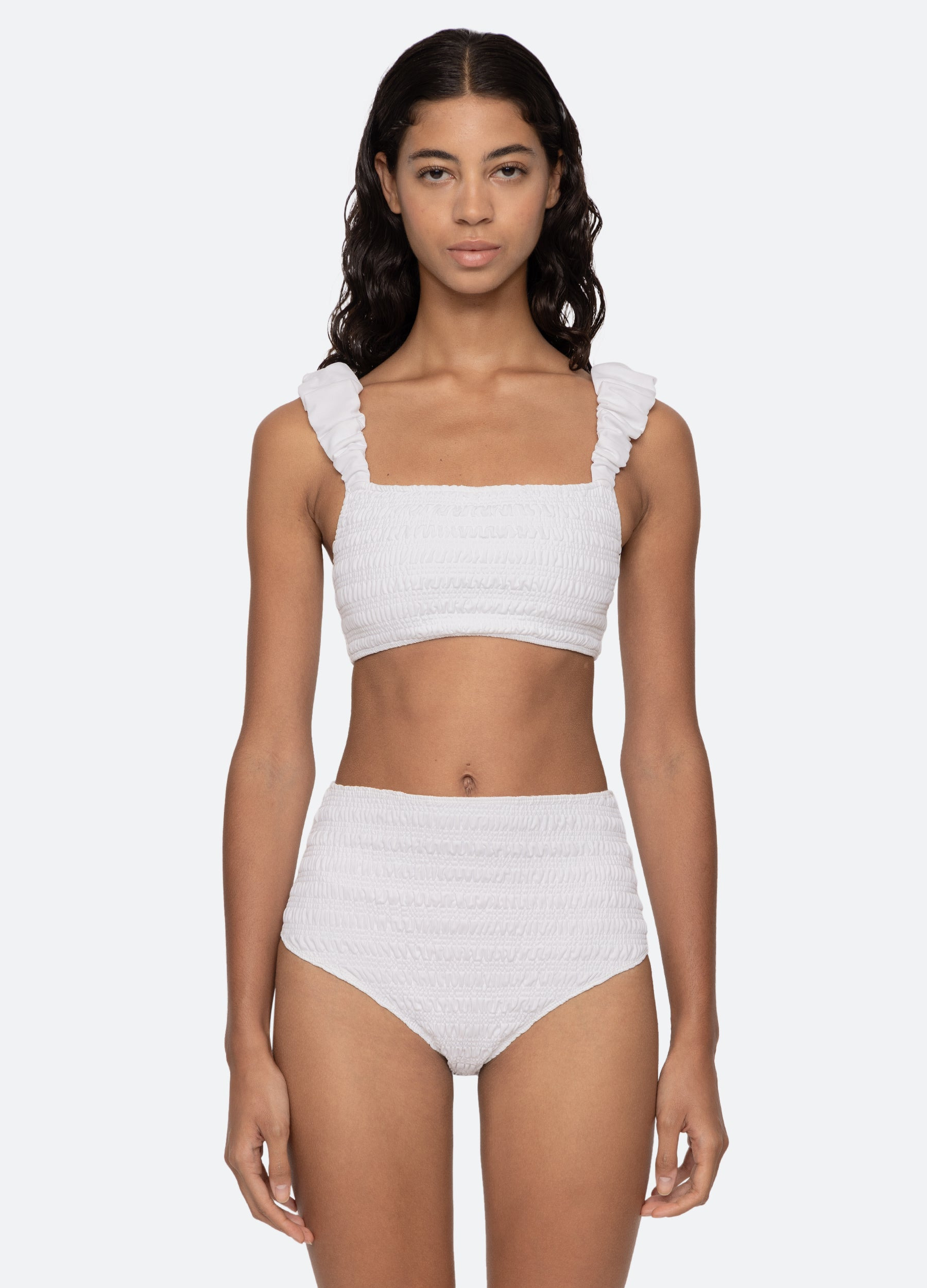 The Shyla smocked bikini top features ruched straps. DETAILS - 88% polyester, 12% spandex - slip on - designed for a slimmer fit - style #SS25-730 - model is 5'10'' and wearing a size S