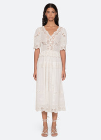 The Sofia embroidered dress features a midi-length silhouette with a deep v-neck, short puff sleeves, and a subtle peplum at the waist. Intricate embroidery with delicate cutouts adds texture and a romantic, airy finish. DETAILS - self-100% cotton - lining-100% cotton - embroidery-100% polyester - button front - designed for a relaxed fit - style #SS26-046 - model is 5'10'' and wearing a size S