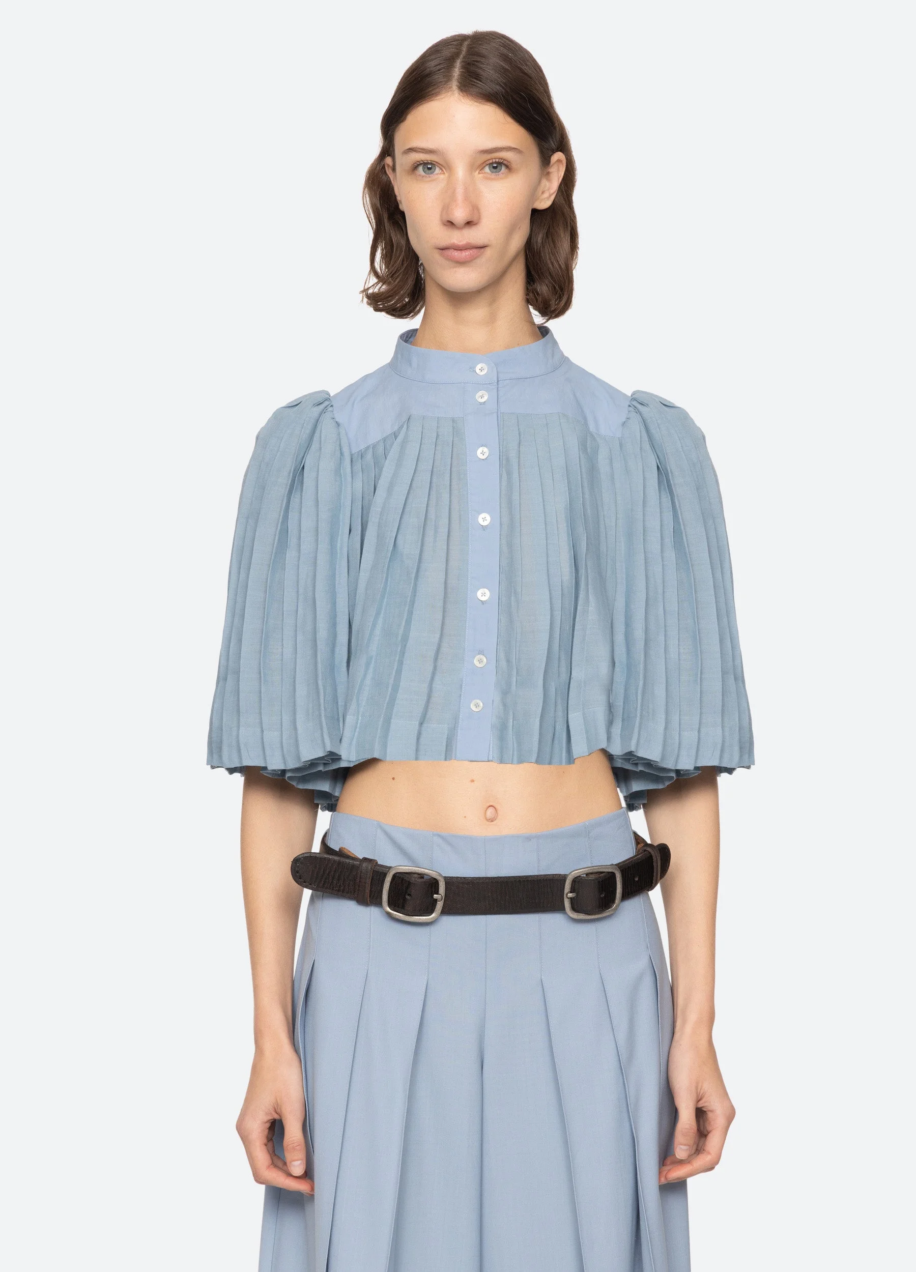 The Solene short sleeve top features a cropped silhouette and is defined by detailed pleating that adds texture and effortless movement. DETAILS - top-100% cotton; bottom-100% ramie - button front - designed for a relaxed fit - style #RS26-095 - model is 5'10'' and wearing a size S