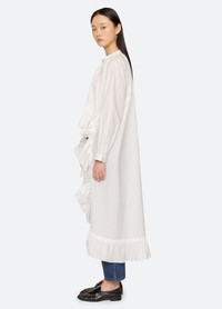 The Solene high-low top is crafted from crisp white shirting and features a dramatic high-low hem. Voluminous ruffle trim around the garment adds a sculptural, statement making finish. DETAILS - 100% cotton - button front - designed for a relaxed fit - style #RS26-099 - model is 5'10'' and wearing a size S