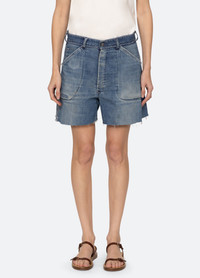 The Spencer denim shorts feature a relaxed fit with a frayed hem. DETAILS - 100% cotton - button & zipper closure - designed for a relaxed fit - style #PF25-085 - model is 5'10'' and wearing a size 4