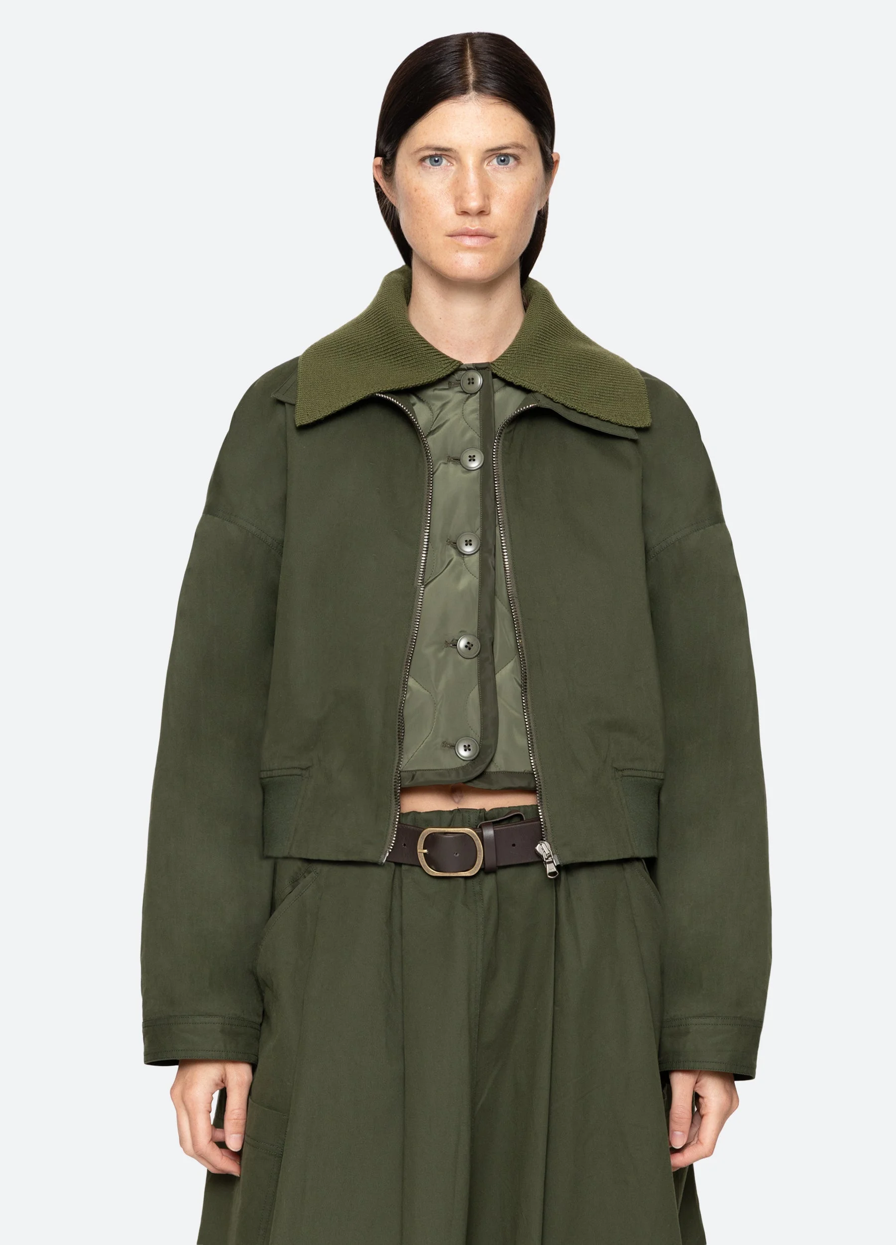 The Sullivan bomber jacket features a structured outer shell and a quilted jacket underneath, offering a refined, layered silhouette with added warmth and visual depth. Finished with a ribbed collar, discreet pockets, and a cropped silhouette, it blends utilitarian function with minimalist sophistication. DETAILS - self-100% cotton - lining-100% cotton - combo-95% cotton, 5% spandex - zipper & button front closure - style #AW25-064 - model is 5'10'' and wearing a size S