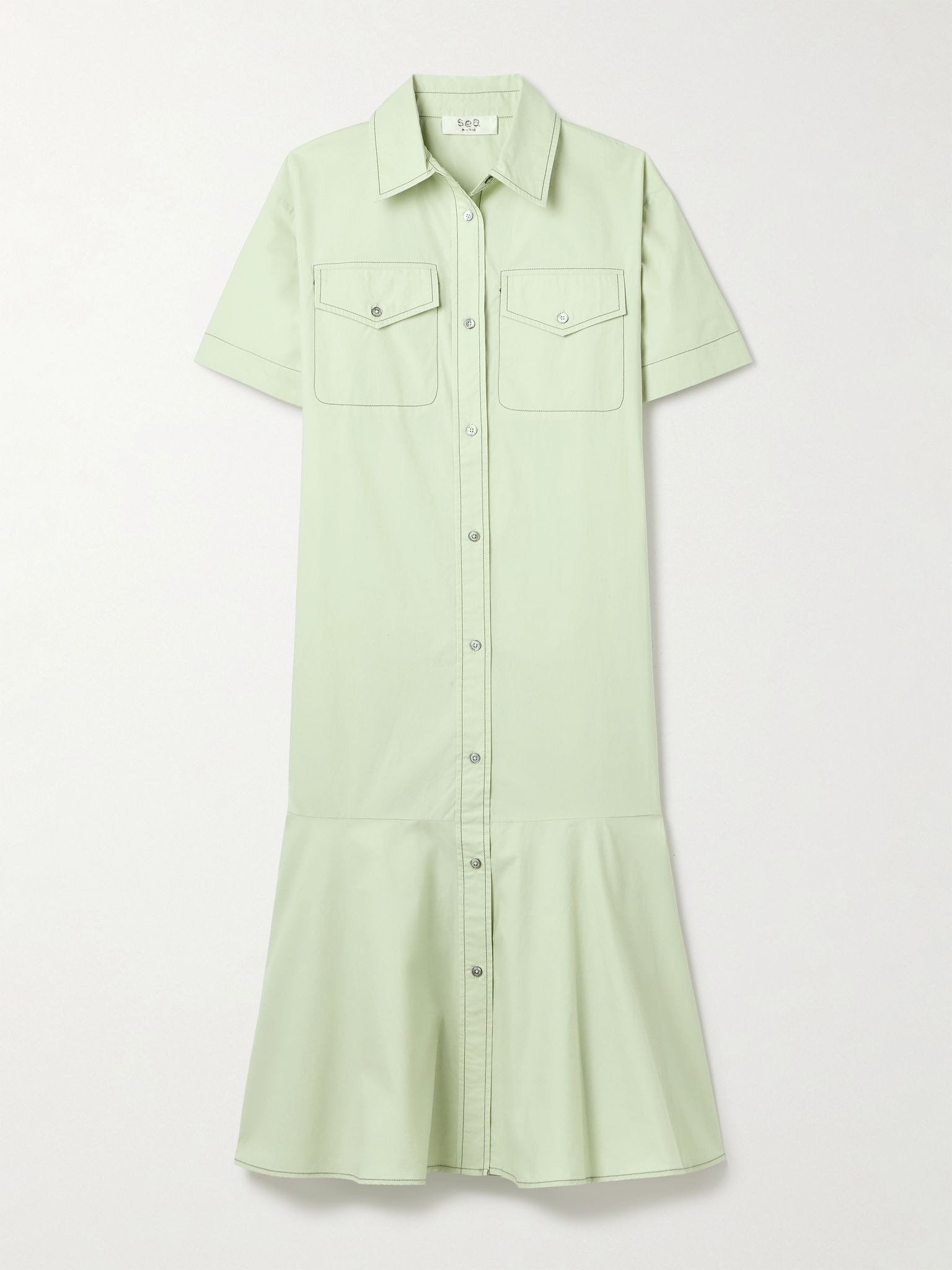 Sea refreshes the utilitarian shirt dress with a flouncy hem, resulting in this effortlessly feminine ‘Sullivan’ style. Made from cotton-poplin, it has a loose fit and buttoned chest pockets outlined in tonal threads. Size & Fit - Fits true to size, take your normal size - Designed for a loose fit - Lightweight, non-stretchy fabric - Model is 177cm/ 5'10" and is wearing a size XSmall Model measurements: - Bust: 79cm/ 31" - Waist: 61cm/ 24" - Hip: 85cm/ 33.5" Details & Care - Light-green cotton-poplin - Button fastenings through front - 100% cotton - Unlined - Hand wash - Mother-of-pearl: India