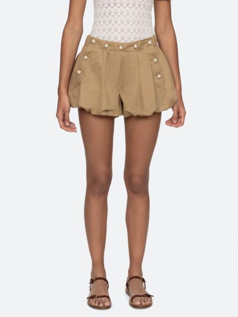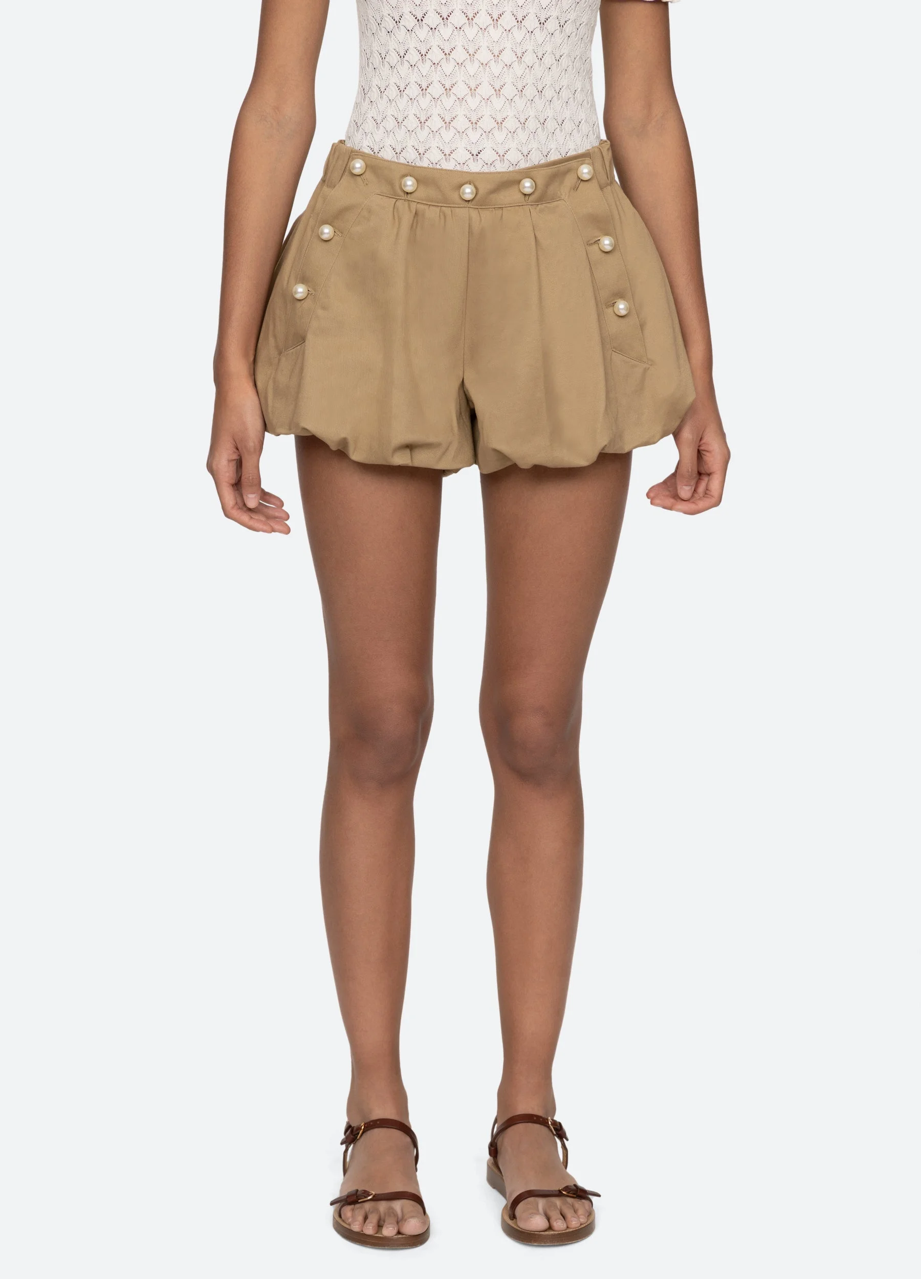 The Suzette bubble shorts feature pearl button accents, voluminous bubble hem and elasticized waistband. DETAILS - self-100% cotton - lining-100% cotton - front & side button closure - designed for a slimmer fit - elasticized back - style #PF25-091 - model is 5'10'' and wearing a size 4