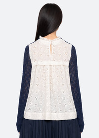 The Teagan combo sweater is crafted from soft alpaca wool at the front and features intricate embroidery on the back. Finished with a delicate ruffle at the collar and ribbed-knit trim at the cuffs and hem, it combines texture and subtle detailing for a refined, feminine touch. DETAILS - self-55% alpaca, 45% polyamide - combo-100% cotton - button back closure - designed for a relaxed fit - style #SS26-050 - model is 5'10'' and wearing a size S