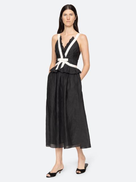 The Thalia midi dress features a deep v-neckline, fixed bow detail and pleated detailing throughout. DETAILS - self-100% ramie - lining-100% cotton - invisible back zipper - designed for a slimmer fit - style #PF25-097 - model is 5'10'' and wearing a size 4