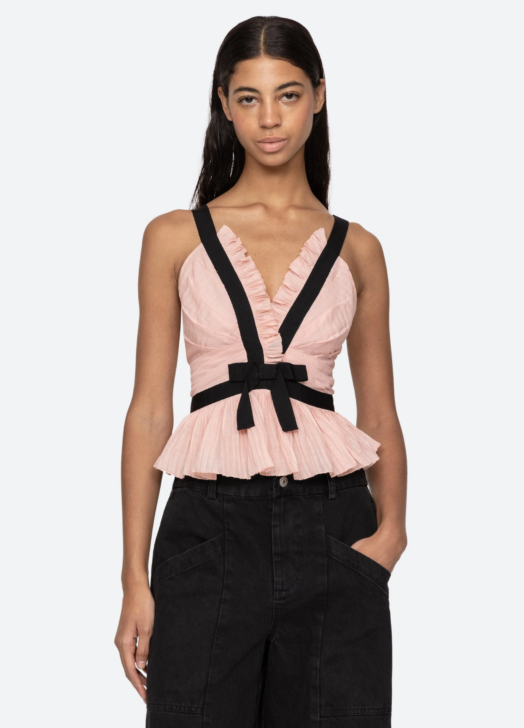 The Thalia tank top features a deep v-neckline, fixed bow detail and pleated detailing throughout. DETAILS - self-100% ramie - lining-100% cotton - invisible back zipper - designed for a slimmer fit - style #PF25-094 - model is 5'10'' and wearing a size 4