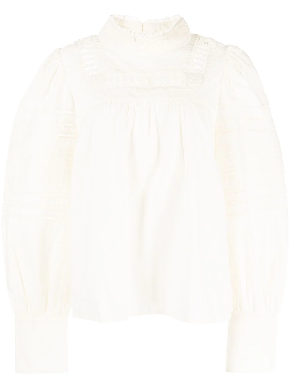 Thora crochet-trim blouse white cotton crochet trim round neck long puff sleeves curved hem Imported Composition Cotton 100% Washing instructions Dry Clean Only