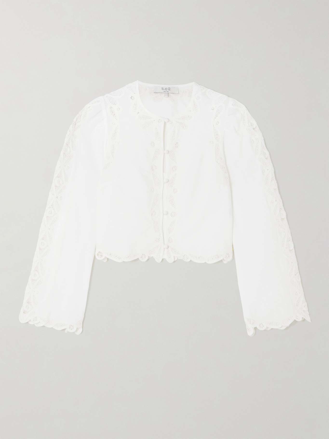 EDITORS'NOTES Sea's 'Elke' top is decorated with soutache embroidery - a needlepoint technique that originated in 16th century France. Made from airy cotton-voile, it's tailored with a slim, cropped bodice and flared sleeves that are subtly gathered along the shoulder for a gentle puff. SIZE & FIT Model measurements: - Fits true to size, take your normal size - High-rise, cut for a slightly loose fit - Mid-weight, non-stretchy fabric - Model is 177cm/ 5'10" and is wearing a UK 8 - Bust: 85cm/ 33” - Waist: 66cm/ 26” - Hip: 92cm/ 36” DETAILS & CARE - White cotton-voile - Button fastenings through front - 100% cotton - Dry clean