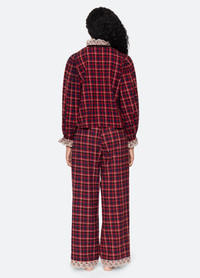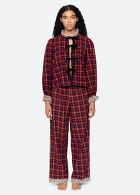 The Zahara plaid pajama set is crafted with a classic plaid pattern and delicate eyelet trim, lending a detailed, feminine touch. Velvet front tie closures complete the style, combining effortless comfort with charming detail. DETAILS - 100% cotton - tie front - elasticized waist - designed for a relaxed fit - style #RS26-806 - model is 5'10'' and wearing a size S