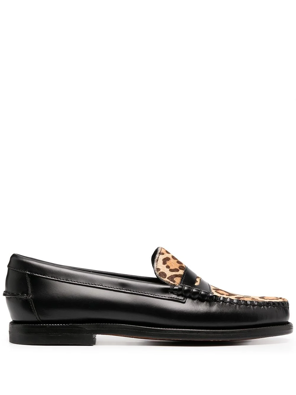 leopard-print loafers black/beige leather leopard print round toe slip-on style branded insole low heel Imported Composition Outer: Leather 100% Lining: Leather 100% Sole: Leather 100% SIZE & FIT Measurement HEEL 0.59 in(1.5 cm) Sole height 0.39 in(1 cm)