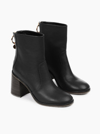The Aryel leather ankle boot pairs a sleek upper with a chunky stacked heel for all-day wear. At the back, a gold ring zipper pull with the See By Chloé engraved medal lends a signature finish to this elegant heeled boot. PRODUCT DETAILS Heeled ankle boot heel height: 3.1" (80 mm) - Upper: leather - Lining: leather - Sole: rubber Fit true to size - Heeled boot - Golden ring zipper pull at the back - Medal engraved with the "See By Chloé" logo Color: Nero Item code: CHS23A042NA999