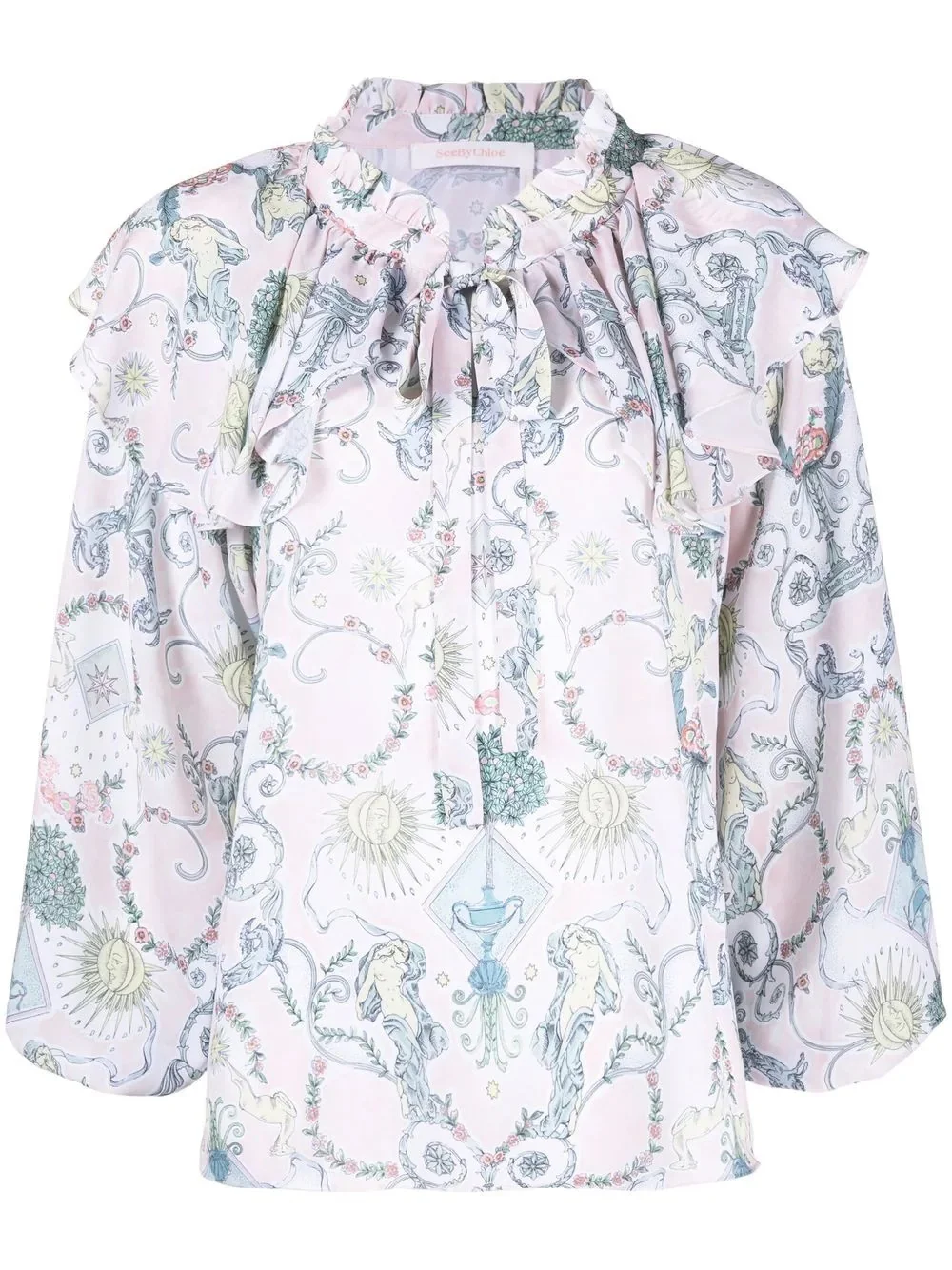 baroque-print ruffled blouse Embodying two of See by Chloe's distinguishing aesthetics - romantic and whimsical - this billowy blouse is patterned with an illustration-style baroque print and finished with ruffled detailing on the neck and shoulders. Imported Composition Polyester 100% SIZE & FIT Model measurements Height 5 ft 10 in(1.78 m) Bust/Chest 33.07 in(84 cm) Hips 35.82 in(91 cm) Waist 25.98 in(66 cm) FittingInformation This piece fits true to size. We recommend you get your regular size Cut for a loose fit Made with a lightweight non-stretch fabric Washing instructions Machine Wash