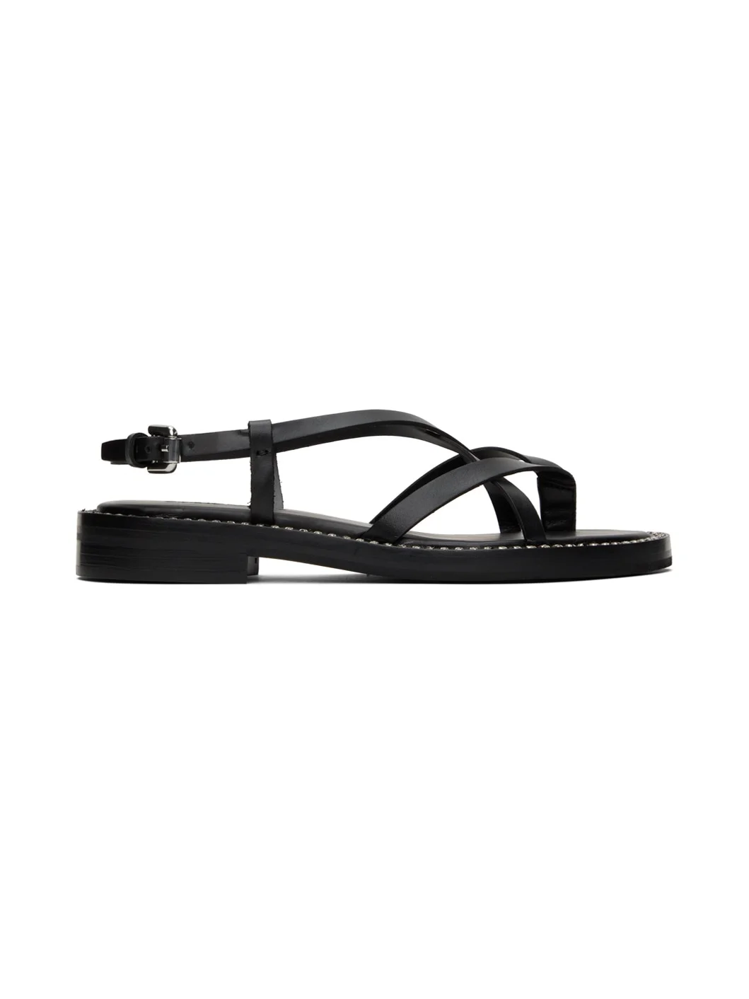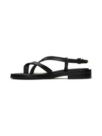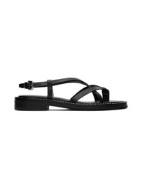 Buffed calfskin flat sandals in black. · Thong-style strap at open toe · Criss-crossing straps at vamp · Pin-buckle slingback strap · Logo embossed at padded calfskin footbed · Crystal-cut detailing at welt · Stacked leather block heel with rubber injection · Leather sole · Heel: H1" Supplier color: Black Upper: calfskin. Sole: leather, rubber. Made in Spain 241373F124008