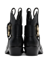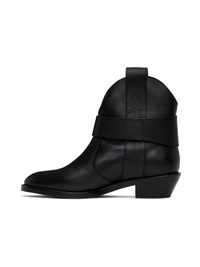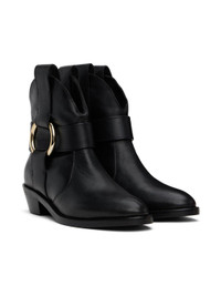 Ankle-high buffed leather boots in black. · Pointed toe · Pull-loops at collar · Embossed logo and O-ring at outer side · Stacked leather heel · Rubber sole · Gold-tone hardware · Heel: H1.5" Supplier color: Black Upper: leather. Sole: rubber. Made in Spain 242373F113005