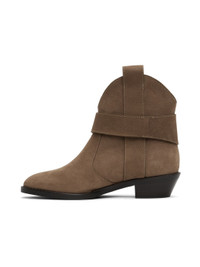 Ankle-high nubuck boots in brown. · Pointed toe · Pull-loops at collar · Embossed logo and O-ring at outer side · Stacked leather heel · Rubber sole · Gold-tone hardware · Heel: H1.5" Supplier color: Taupe Upper: leather. Sole: rubber. Made in Spain 242373F113004