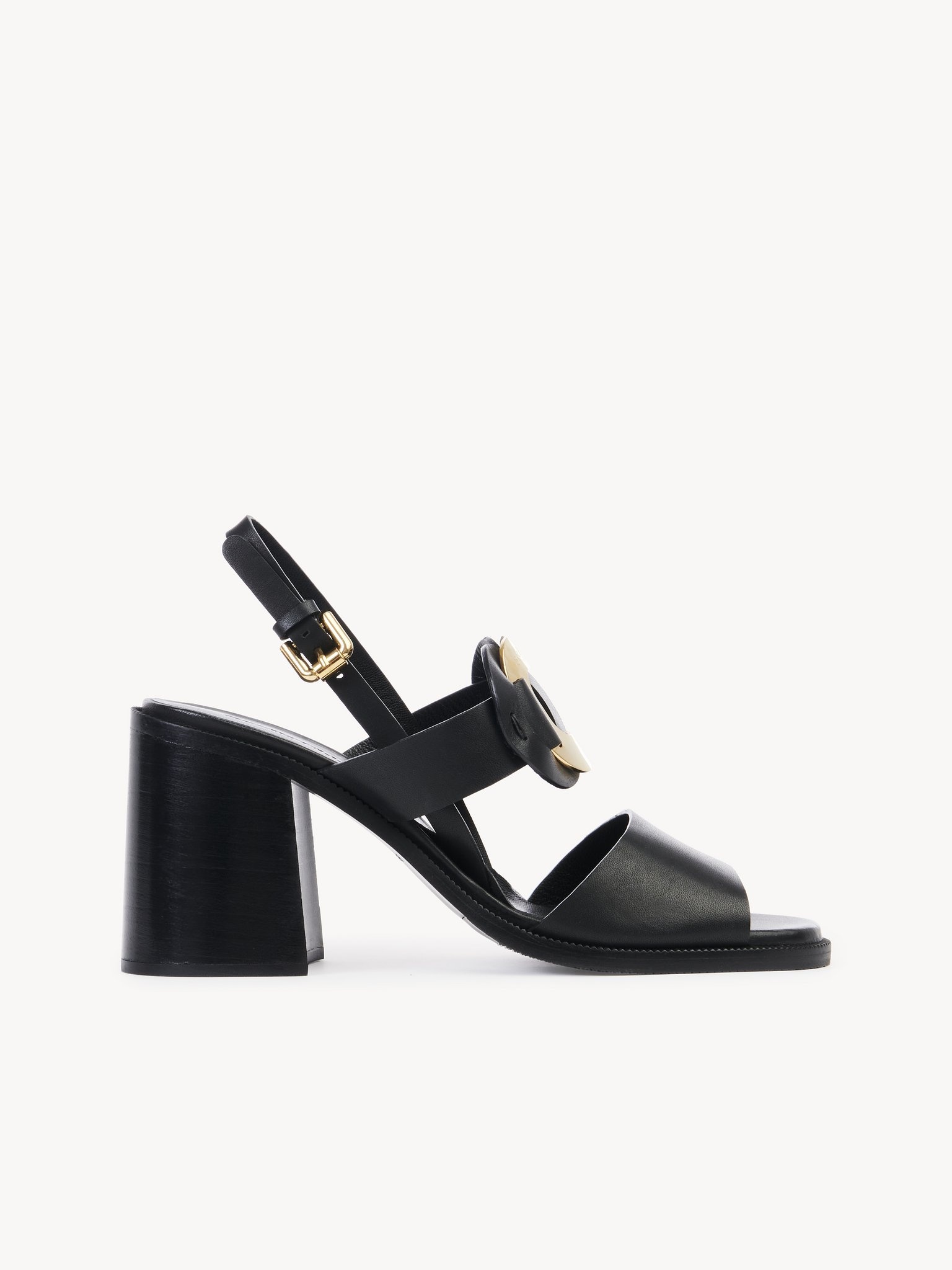 Chany high-heel sandal in natural calfskin with hand-stitched details. Leather rings are interlaced with gold-toned See By Chloé-engraved hardware. The adjustable buckle strap ensures a comfortable fit. PRODUCT DETAILS High-heel sandal heel height: 3.1” (80 mm) - Upper: natural calfskin - Sole: tunit - Lining: goat leather Fit true to size - Leather sandal - Adjustable buckle strap Color: Nero Item code: CHS23S013CA999