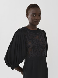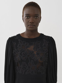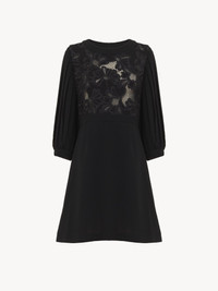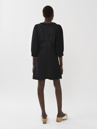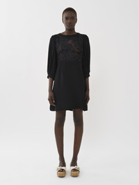 A-line mini dress in lower-impact crêpe with a delicate floral guipure bodice. Pleated puffy three-quarter sleeves lend an elegant finish to this little black dress. PRODUCT DETAILS Guipure mini dress main material: 100% polyester Care: Hand wash/Do not dry clean Fit: A-line, mini length - Mini dress - Guipure bodice - Pleated puffy three-quarter sleeves - Invisible zipper at the back Recycled polyester keeps its natural softness and inherent quality, with a reduced environmental impact. Using recycled polyester enables us to extend the lifespan of a fiber that has already been produced. Color: Black Item code: CHS23SRO05025001