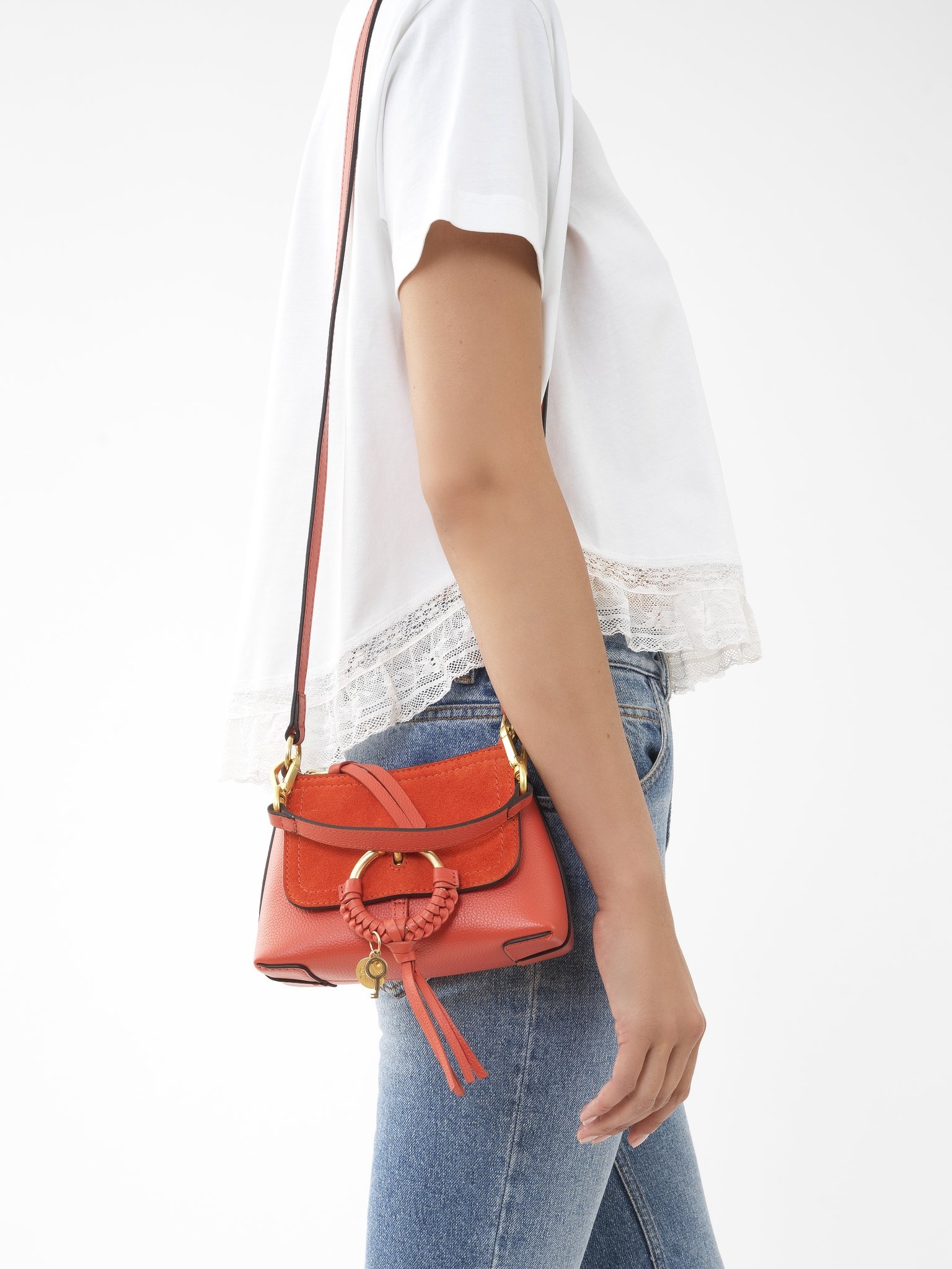 Joan mini crossbody bag in a refined combination of grained and suede cowhide with a zippered trapezoid silhouette. The compact interior and front flap make this an elegant day-to-evening mini bag. The Joan line's signature feminine braided O-ring features the See by Chloé key and medal. PRODUCT DETAILS Crossbody bag in grained & suede cowhide leather Carry: cross-body, long shoulder & hand - Top zipper closure - 1 removable handle and 1 long strap - 1 main compartment - 1 flat pocket with a flap closed by an oversized round hook on the front - 3 card slots inside - Gold brass finish - Cotton canvas lining Comes with a dust bag - Width: 7.5" (19 cm) - Height: 5.1" (13 cm) - Depth: 3.3" (8.5 cm) - Strap length: 20.5" (52 cm) This mini bag is made of velvet leather. To preserve its natural appearance and velvety feel, it has not been treated. As such, it is more sensitive to light, staining and color bleeding. Avoid prolonged contact with contrasting colored fabrics that may bleed (e.g. denim). Avoid rubbing the product against rough surfaces and protect it from sources of humidity/light/heat/liquid/grease. To make this purse, Chloé worked with Leather Working Group (LWG) certified leather manufacturers. LWG certifies tanneries based on their water and energy usage, management of chemicals, solid waste, and wastewater. Color: Gipsy Orange Item code: CHS18WS975330839