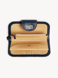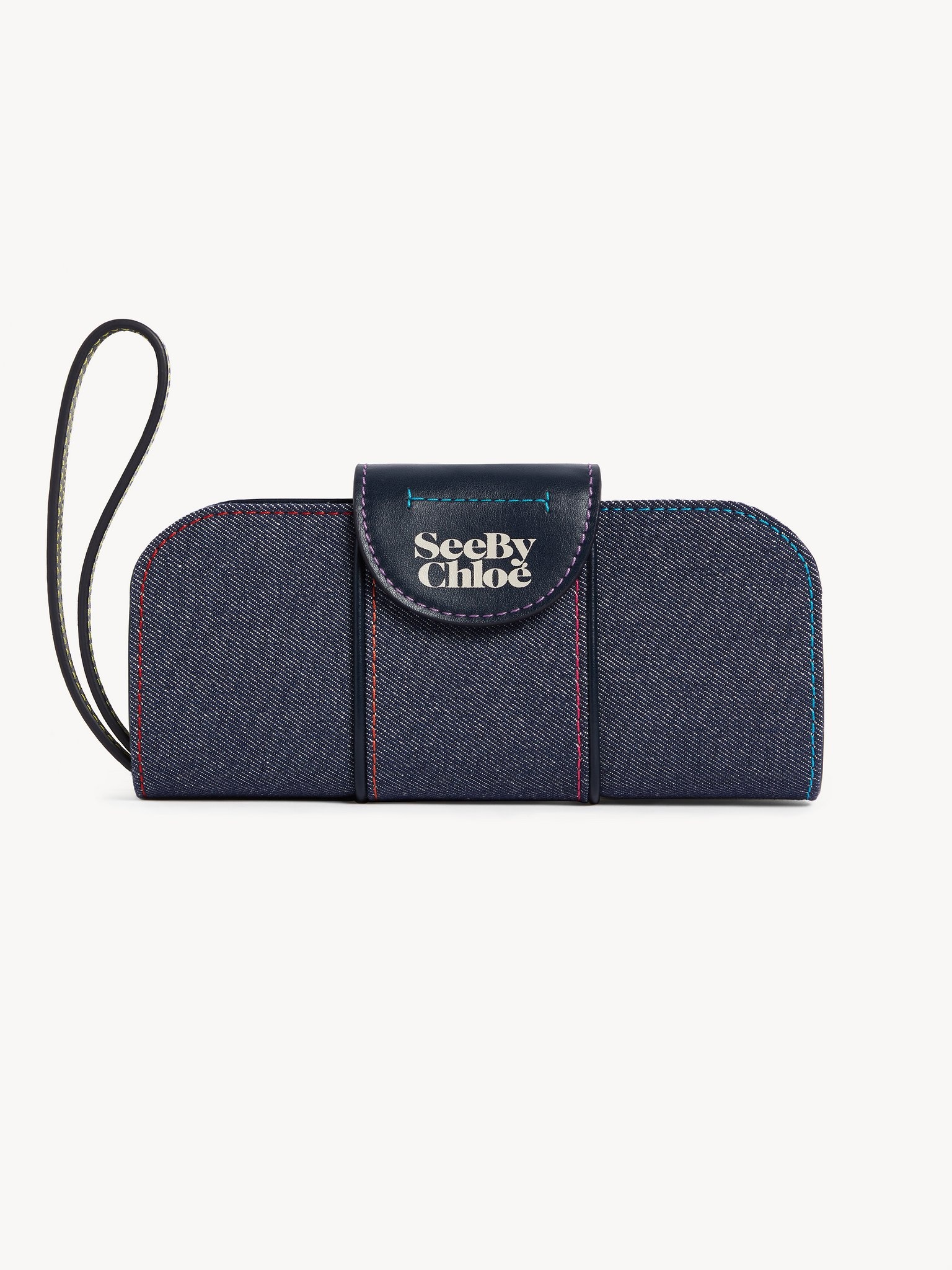 Laetizia folded wallet in denim with a long silhouette and a roomy main compartment. Multicolor stitching creates a vibrant summer mood while the See By Chloé logo lends a signature finish. PRODUCT DETAILS Laetizia long folded wallet in colored stitching on denim - Snap button closure Inside: - 2 main compartments - 1 pocket with snap button closure - 1 zippered pocket - Cotton canvas lining - Width: 7.9" (20 cm) - Height: 4.7" (12 cm) - Depth: 1.6” (4 cm) This long wallet is made of denim fabric. Just like on real jeans: -The blue color is sensitive and may discolor. -Differences in tone may occur on different parts and from one product to another. In order to preserve it: -Avoid prolonged contact with light-colored materials -Avoid rubbing your product against abrasive surfaces -Protect it from sources of moisture/light/heat/liquid/grease. Recycled cotton keeps its natural softness and inherent quality, with a reduced environmental impact. Using recycled cotton enables us to extend the lifespan of a fiber that has already been produced. Color: Denim Item code: CHS23UPB21D2345D